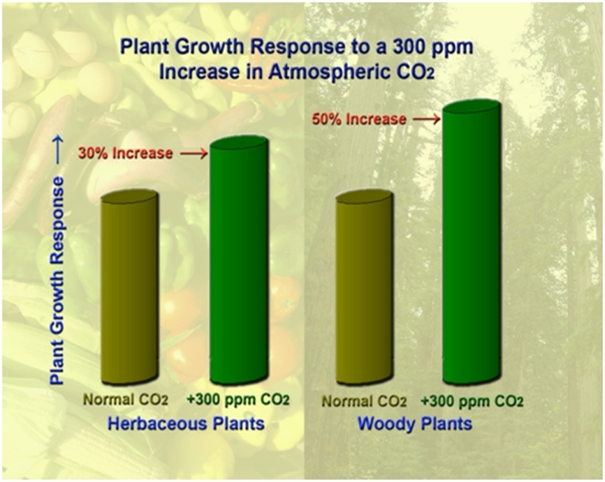 Rast biljaka u postojećoj i atmosferi s 300 ppm-a više CO2. Lijevo zeljaste biljke, desno drvenaste (Wittwer, 1997.)