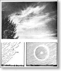 Krug oko Sunca ili Meseca uvek je bele boje, a oreol je sastavljen od duginih boja. Tipičan izgled perjasto-slojastog CIRUSA i slojastog CIROSTRATUSA sa krugom oko Sunca pokazuje (slika dole).